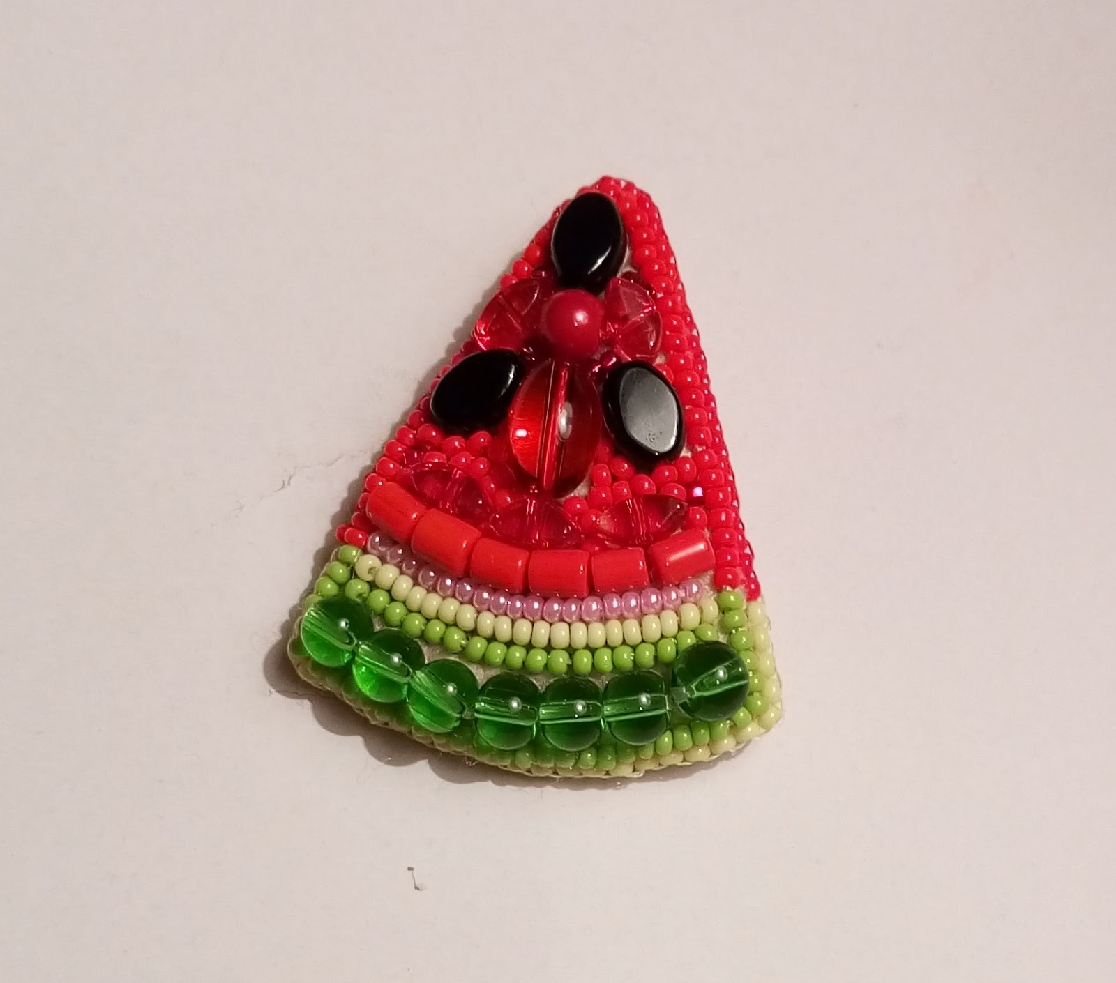 Допис фіксує початок виготовлення другої серії вишитих брошок і їх також буде шість. Десь у глибині душі я сподіваюся, що прийдешні свята подарують мені можливість не лише виготовляти прикраси а і просто дозволять добре провести час, щоб відчути святковий настрій. Але, звісно, заняття будь якою улюбленою справою високо цінується незалежно від того якою :-) Ця серія складається з дуже різних брошок і лише одна з них - шматочок умовного фрукта, який я сьогодні і зробила. Але чи то через те, що це не мій улюблений фрукт, чи через втому в кінці семестру, всі намистини, крім найбільшої червоної у центрі, перешивалися двічі під час роботи, тому що я весь час була не задоволена тим, що у мене одразу виходило. Нарешті вона готова і виглядає дуже яскраво і життєрадісно, як будь який соковитий фрукт:-)